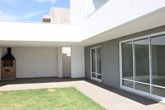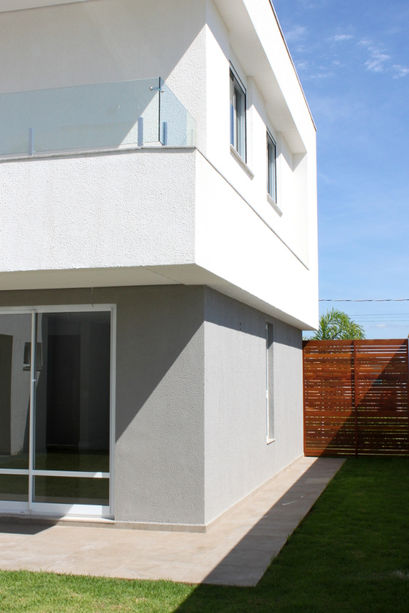 Sobrado de estilo moderno e fachada com detalhes de volumetria que destacam o andar superior.