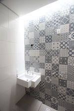 A identidade da fachada foi definida pelo uso de alguns elementos como tijolinho aparente, jardineira, banco de concreto no térreo, paisagismo, varanda invertida, pergolados e azulejos decorativos.